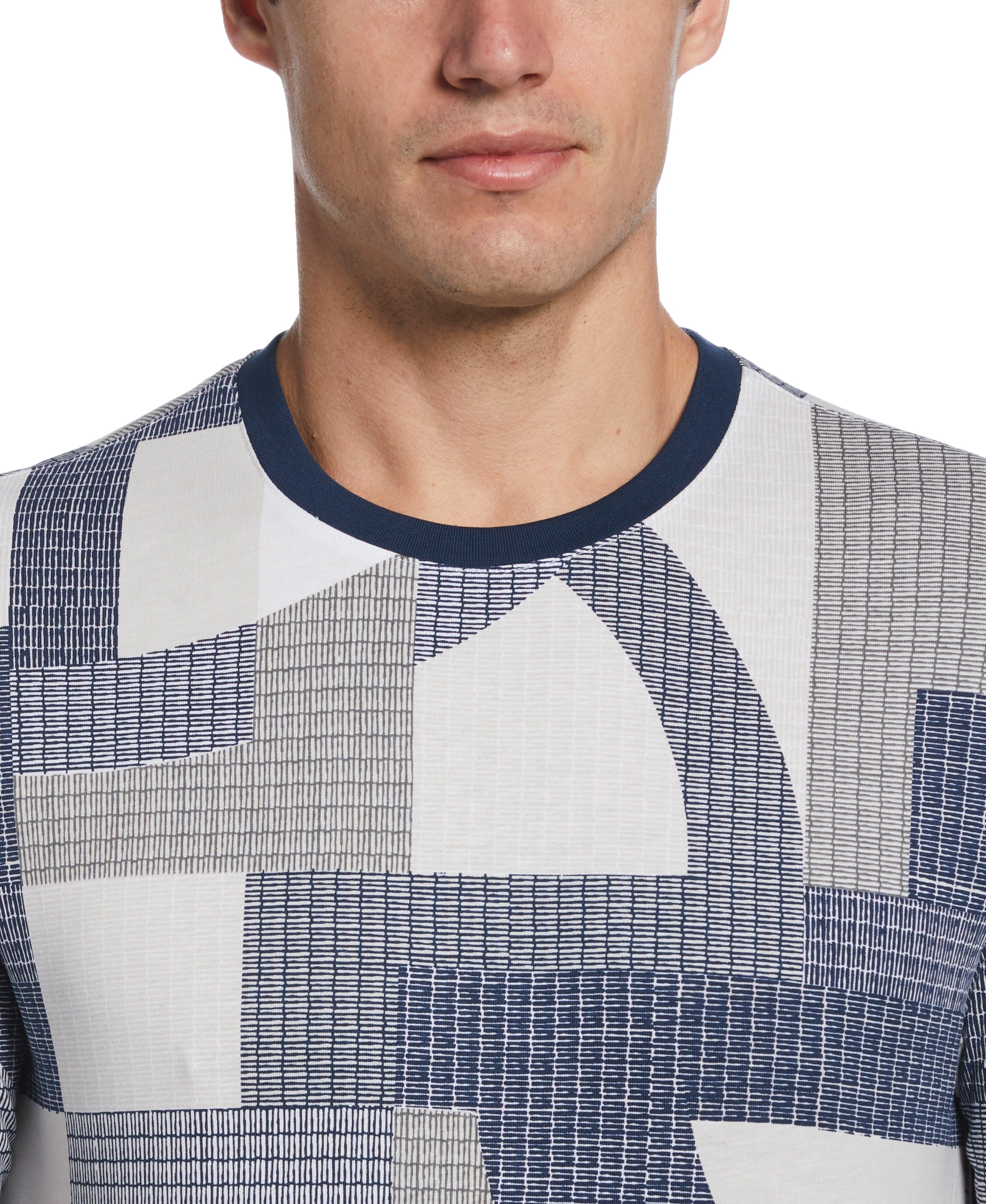 This cotton tee by Perry Ellis adds a little extra drama to your wardrobe with a bold abstract geometric print. Interlock fabrication creates natural stretch in the cotton material for a fit that's comfortable to wear on weekends, date nights and more.