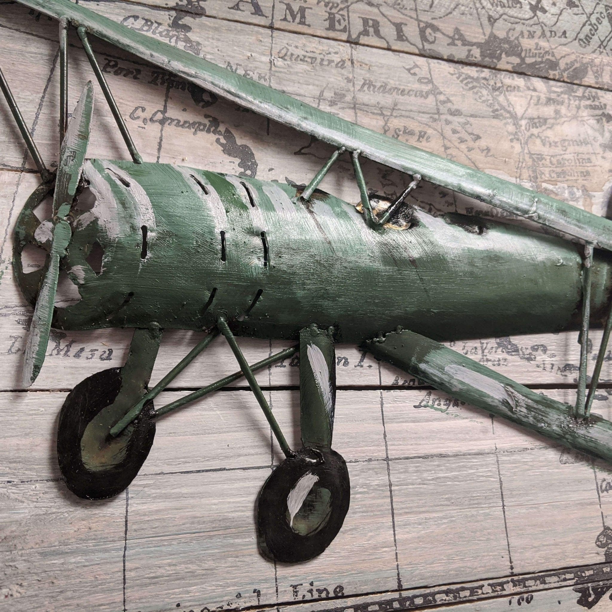 The plane is made from metal and the vintage backdrop is solid pine. This is the third in a series of similar works by the same artist. It measures 24" x 16".